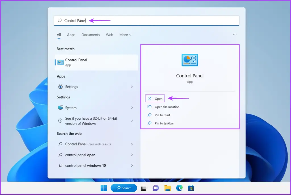 Ein weiterer nützlicher Ort, an dem Sie das Farbmanagement leicht finden und darauf zugreifen können, ist die Systemsteuerung. So öffnen Sie die Systemsteuerung und klicken auf die Option „Farbverwaltung“ auf Ihrem Windows 11-Computer.Schritt 1: Drücken Sie die Windows-Taste + S, um die Windows-Suche zu öffnen, und geben Sie Systemsteuerung ein. Klicken Sie dann in den Ergebnissen der Systemsteuerung auf Öffnen.