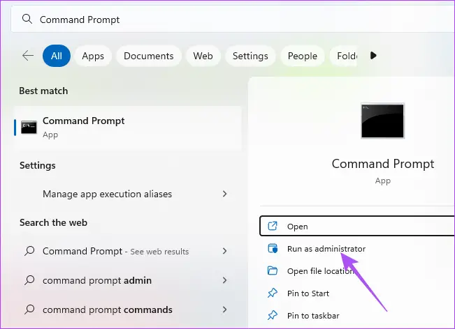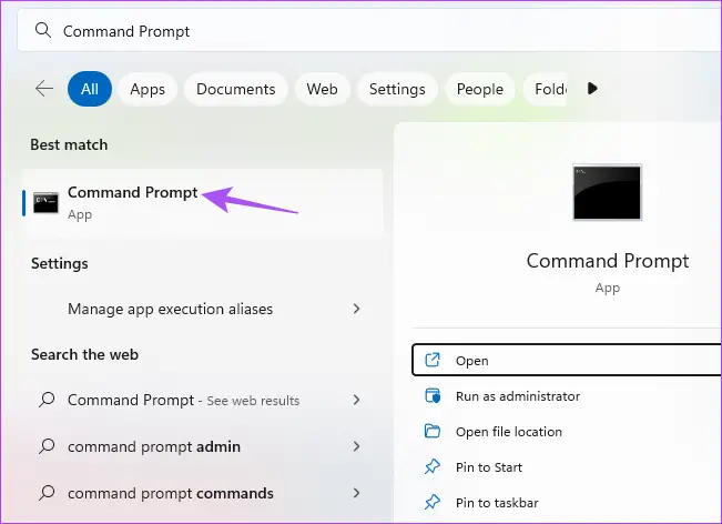 Eine weitere fortschrittliche Lösung besteht darin, dass Sie die Eingabeaufforderung verwenden können, um das Festplattendienstprogramm zu starten. Es scannt Ihr SD-Kartenlaufwerk, um Probleme zu erkennen und zu beheben, die dieses Problem wahrscheinlich verursachen. Hier ist, wie es geht.Schritt 1: Verbinden Sie Ihre SD-Karte mit Ihrem Windows 11-PC.Schritt 2: Klicken Sie auf das Startsymbol und geben Sie Eingabeaufforderung ein.