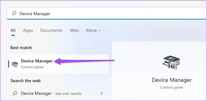 Wenn Sie Ihre SD-Karte immer noch nicht sehen können, sollten Sie versuchen, Ihren SD-Kartentreiber zu aktualisieren. Beschädigte oder veraltete Treiber aufgrund langer Nutzung können der Grund für dieses Problem sein. Obwohl diese Treiber aktualisiert werden, wenn Sie Windows aktualisieren, können Sie sie wie folgt manuell aktualisieren.Schritt 1: Verbinden Sie Ihre SD-Karte mit Ihrem Windows 11-PC.Schritt 2: Klicken Sie auf das Startsymbol, geben Sie Geräte-Manager ein und drücken Sie die Eingabetaste.